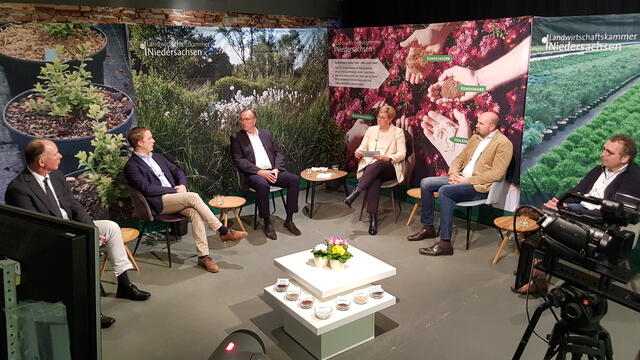 Im Studio des Lokalsenders O1 diskutierten Michael Bank (Landgard eG), Professor Bernhard Beßler (Leiter des LWK-Geschäftsbereichs Gartenbau), Baumschulunternehmer Hajo Hinrichs, Dr. Sebastian Kipp vom Substrathersteller Klasmann-Deilmann, Zierpflanzenproduzent Dirk Klefer und Moderatorin Dr. Gerlinde Michaelis, bei der LWK Leiterin der Lehr- und Versuchsanstalt für Gartenbau in Bad Zwischenahn-Rostrup. Die Fragestunde ist als Aufzeichnung auf der LWK-Website oder bei YouTube zu sehen.